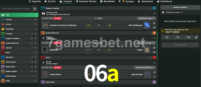 O 06a oferece uma grande seleção de opções de apostas em e-sports com probabilidades competitivas